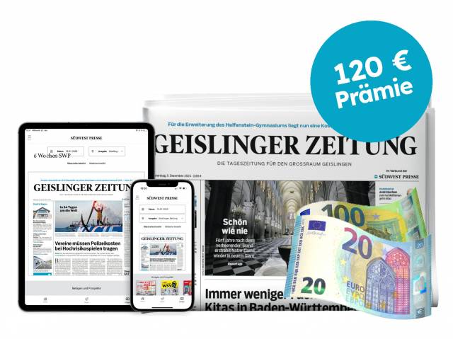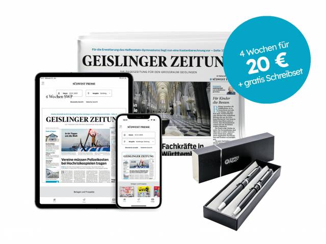 4 Wochen Komplettpaket für nur 20 € testen! Lesen Sie das Komplettpaket Ihrer GEISLINGER ZEITUNG 4 Wochen für nur 20 Euro und erhalten Sie ein exklusives Schreibset gratis dazu.