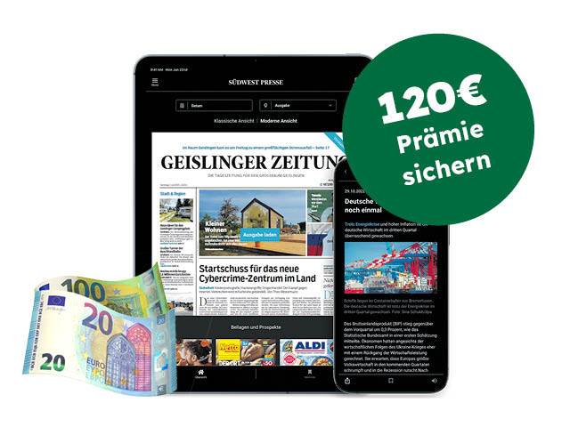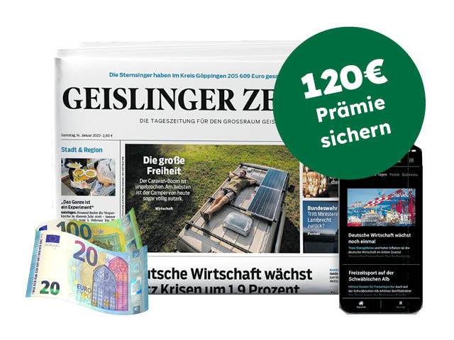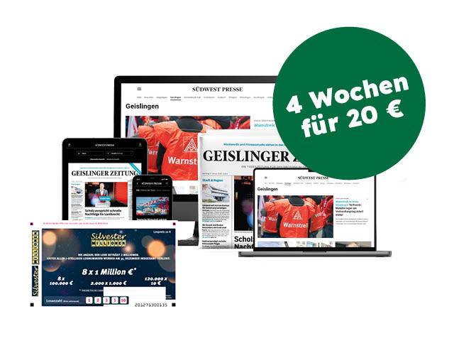 4 Wochen Komplettpaket für nur 20 € unverbindlich testen! Entdecken Sie mit Ihrer GEISLINGER ZEITUNG Glücksmomente zu Weihnachten und testen Sie Ihre Lokalzeitung 4 Wochen für nur 20 € und sichern Sie sich ein gratis Silvester-Millionen-Los. Jetzt sichern