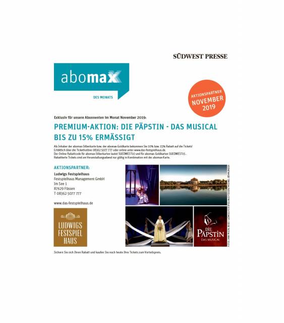 Premium-Aktion: Die Päpstin - das Musical bis zu 15 % ermässigt Als Inhaber der abomax-Silberkarte bzw. der abomax-Goldkarte bekommen Sie 10% bzw. 15% Rabatt auf die Tickets! Erhältlich über die Tickethotline 08362 5077 777 oder online unter www.das-festspielhaus.de. Der Online Rabattcode für abomax-Silberkarten lautet SUEDWEST10 und für abomax-Goldkarten SUEDWEST15 Rabattierte Tickets sind am Veranstaltungsabend nur gültig in Kombination mit der abomax-Karte.