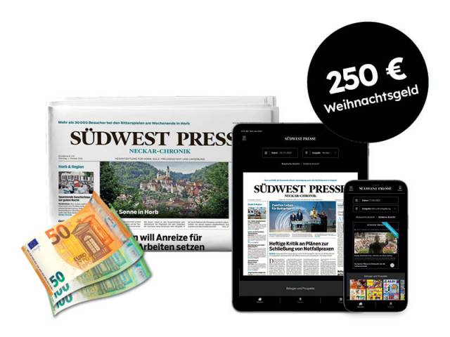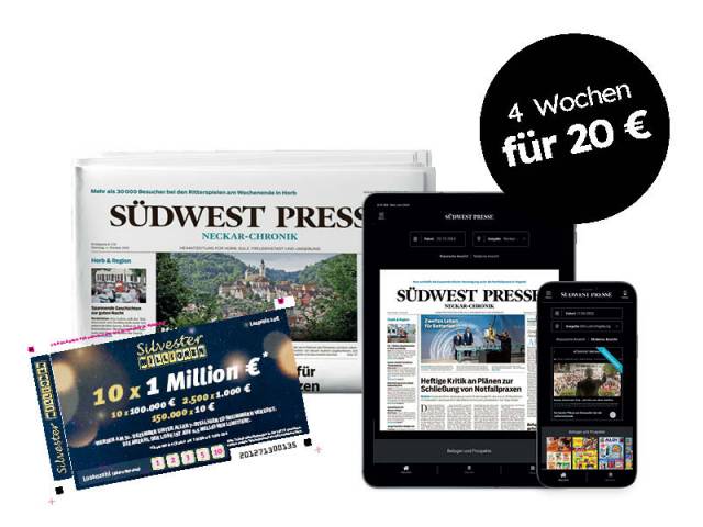 4 Wochen Komplettpaket für nur 20 € unverbindlich testen! Entdecken Sie mit Ihrer NECKAR CHRONIK die schönsten Seiten zu Weihnachten und testen Sie Ihre Lokalzeitung 4 Wochen für nur 20 € und sichern Sie sich ein gratis Silvester-Millionen-Los*Jetzt sichern
