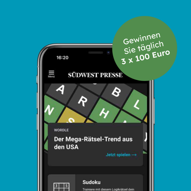 Knobeln, lösen, abkassieren! Noch bis Samstag (01.02.25) gewinnen Sie mit etwas Knobel-Glück täglich 3 x 100 €! Lösen Sie das aktuelle Online-Kreuzworträtsel in der SWP App und übermitteln Sie uns das tagesaktuelle Lösungswort über unser Glücksformular!
