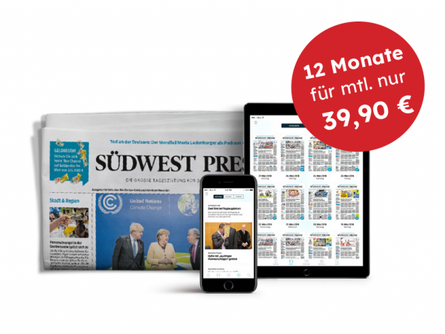 Lesen Sie Ihre Südwest Presse ein volles Jahr für nur 39,90 € pro Monat! Bestellen Sie noch heute Ihr Sonderangebot und sparen Sie damit über 160 €