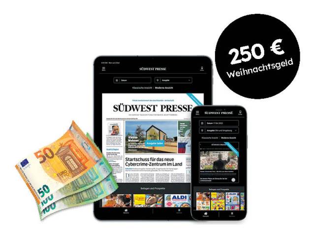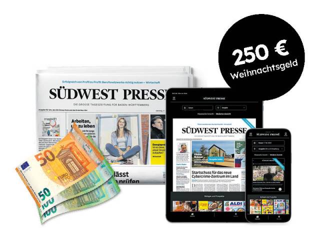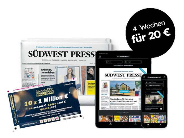4 Wochen Komplettpaket für nur 20 € unverbindlich testen! Entdecken Sie mit Ihrer SÜDWEST PRESSE die schönsten Seiten zu Weihnachten und testen Sie Ihre Lokalzeitung 4 Wochen für nur 20 € und sichern Sie sich ein gratis Silvester-Millionen-Los*Jetzt sichern