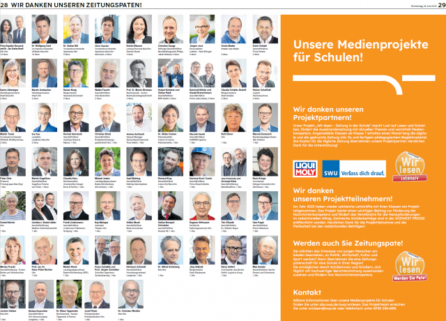 Etwa einen Monat vor Ablauf der 12-monatigen Laufzeit werden Sie von der SÜDWEST PRESSE angefragt, ob sie die Zeitungspatenschaft weiterführen möchten.