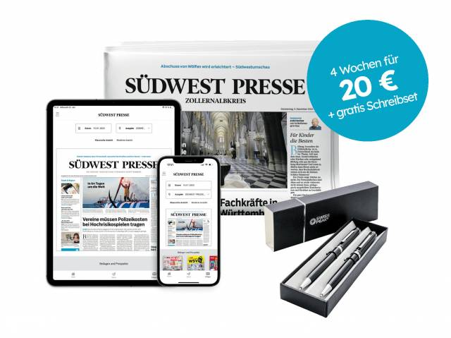 4 Wochen Komplettpaket für nur 20 € testen! Lesen Sie das Komplettpaket Ihrer SÜDWEST PRESSE 4 Wochen für nur 20 Euro und erhalten Sie ein exklusives Schreibset gratis dazu.