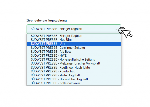 Wählen Sie Ihre Zeitung und lesen ab sofort digital gratis. Nachdem Sie Ihre E-Mail bestätigt haben, können Sie aus allen Regionaltiteln des Verbunds der SÜDWEST PRESSE Ihre gewünschte E-Paper-Ausgabe wählen.