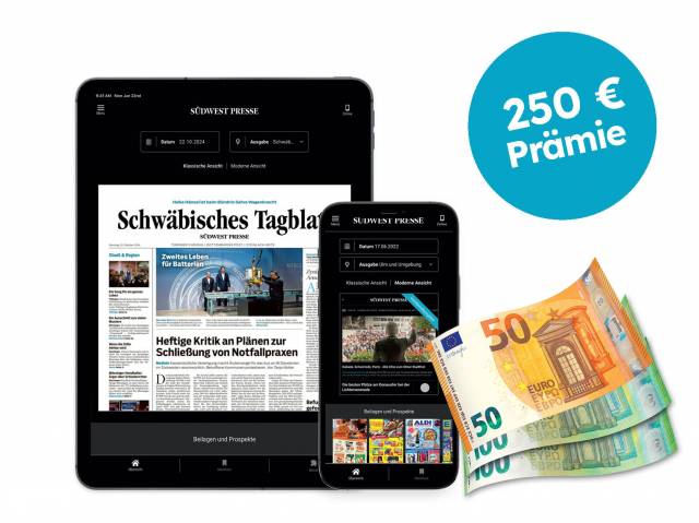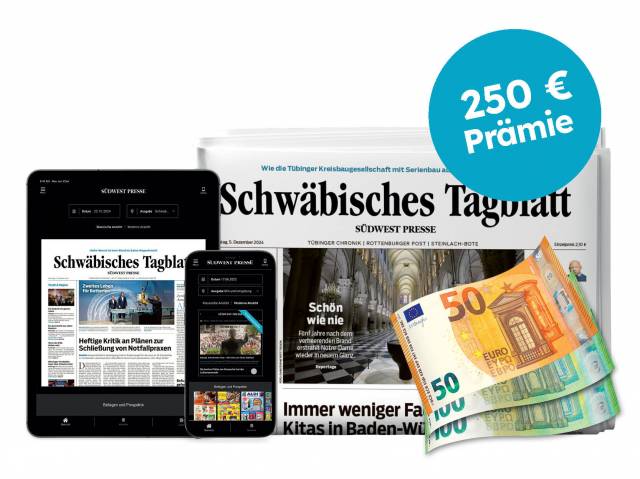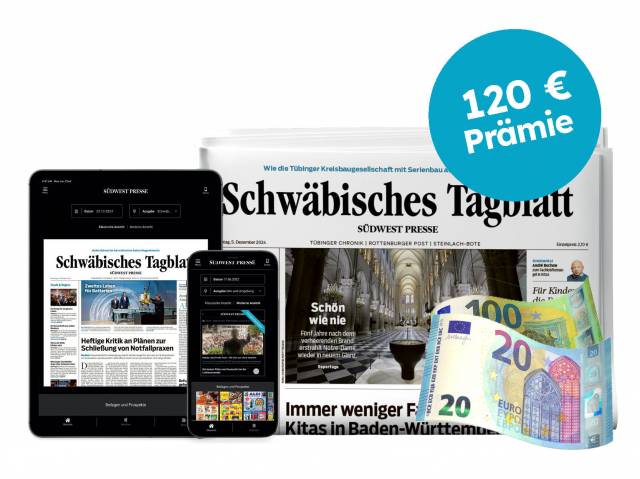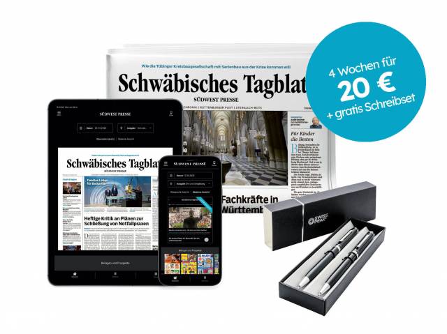 4 Wochen Komplettpaket für nur 20 € testen! Lesen Sie das Komplettpaket Ihres SCHWÄBISCHEN TAGBLATTS 4 Wochen für nur 20 Euro und erhalten Sie ein exklusives Schreibset gratis dazu.